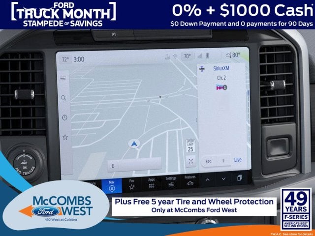 FRONT LICENSE PLATE BRACKET -inc: Standard in states where required by law, optional to all others, EQUIPMENT GROUP 302A MID -inc: Wrapped Steering Wheel, Connected Navigation, 1-year trial, Navigation services require SYNC4 and FordPass Connect (optional on select vehicles), complimentary connect service and the FordPass app (see FordPass terms for details), Eligible vehicles receive a complimentary 1-year trial of navigation services that begins on the new vehicle warranty start date, Customers must unlock the navigation service trial by activating the eligible vehicle w/a FordPass member account, If not subscribed by the end of the complimentary period, the connected navigation service will revert to a moving-map and active routing will no longer be available, Connected service and features depend on compatible AT&T network availability, Evolving technology/cellular networks/vehicle capability may limit functionality and prevent operation of connected features, FordPass app, compatible w/select smartphone platforms, is available via a download, Message and data rates may apply, C, ENGINE: 2.7L V6 ECOBOOST -inc: auto start-stop technology (STD), Variable Intermittent Wipers, Urethane Gear Shifter Material, Trip Computer, Transmission: Electronic 10-Speed Automatic -inc: SelectShift w/progressive range select and selectable drive modes: normal, ECO, sport, tow/haul, slippery and trail, Trailer Wiring Harness, Tires: 245/70R17 BSW A/S, Tire Specific Low Tire Pressure Warning.